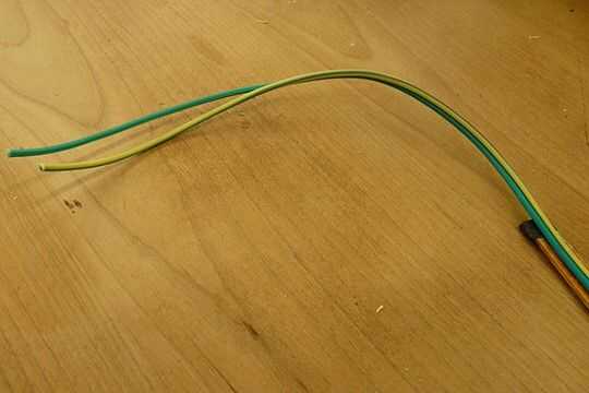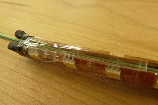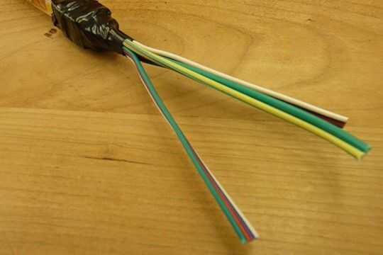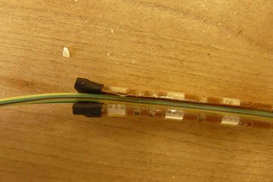 Una vez que el cableado se inicia en el inversor, es hora de preparar las tiras de luz LED de la lámpara. Como probablemente ya han notado, la parte superior de la lámpara tiene una lámpara convencional, así que tenemos que ejecutar el cableado hasta el centro de la lámpara para dar energía a la luz superior. Hacemos esto mediante la ejecución de los hilos para entre las tiras de LED para ocultar los cables.