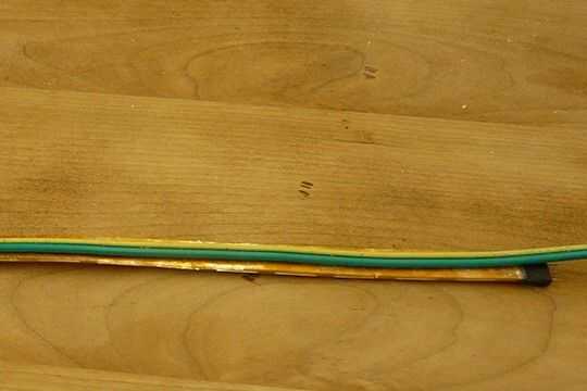 Una vez que las tiras de LED están conectadas a las tiras, corte una longitud de 24 pulgadas de alambre, que servirá para dar energía a la luz superior. En la parte posterior de las tiras de LED hay una cinta de la cáscara y del palillo, pelar el papel de la cinta de una de las franjas de luz y asegurándose de que se deje bastante el exceso de cable en ambos lados del LED, las longitudes de dos pies de cables en la parte posterior de la luz LED del palillo.
