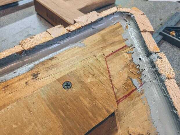 En el labio de corte en la parte posterior calafatear alrededor de los bordes para bloquear la luz. No quiero ver luz escapando entre los listones. Esto ayuda a la pieza se sienten más sólidos cuando no parece que es hueco. Es sucio, pero se oculta.