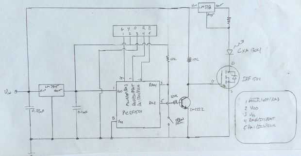 No es que esto es particularmente complejo, pero aquí es la teoría de operación... Opté por usar un controlador PIC sencillo y barato (PIC12F1501) para hacer el flasheo para mí... el L78L05 es un regulador de 5V pequeña que cae el poder de la nave (13, 6V) de 5 voltios para el controlador PIC.