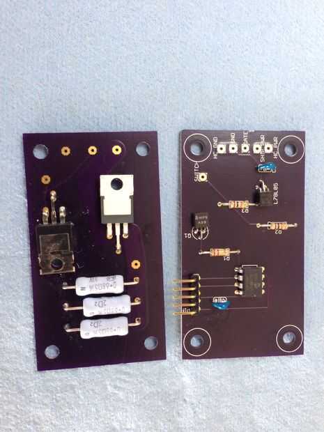 Construí la tarjeta caliente un poco diferente... como veis en la foto, montados los componentes (IRF510 LM338 y las tres resistencias)... en la parte posterior de la tarjeta,... ¡ HACIA ADELANTE! Lo hice para que la superficie de montaje del disipador de calor en el regulador y el mosfet puede montar directamente al disipador térmico. Vea las fotos.