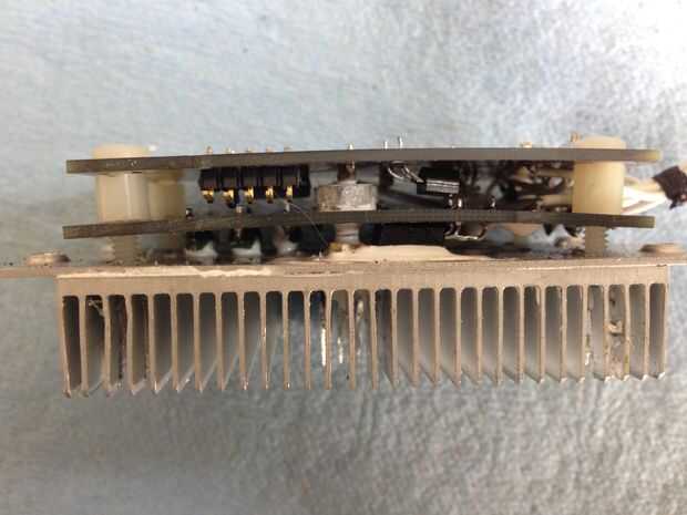 Montado en un disipador de calor de desecho que tenía sobre el exterior de un RadioShack 3 x 2 x 1 proyecto cerramiento aluminio placa con grasa térmica, tornillos de nylon. La Junta caliente entonces fue montada en el interior de la placa de cubierta de aluminio con aisladores fenólicos TO-220 (soluciones de Wakefield 7-173-220 P, o buscalo en google "aislante TO-220"). El aislador es necesario porque las espaldas del LM338 y el IRF510 son eléctricamente activas, y no queremos conectados uno al otro o a la caja de aluminio y disipador de calor! De nuevo, utilice más pasta térmica en ambos lados del aislante, sobre las espaldas del LM338 y IRF510, etc.. Incluso puse algunos en las resistencias, ya que en mi aplicación Contacta con la Asamblea de la placa y el disipador térmico.