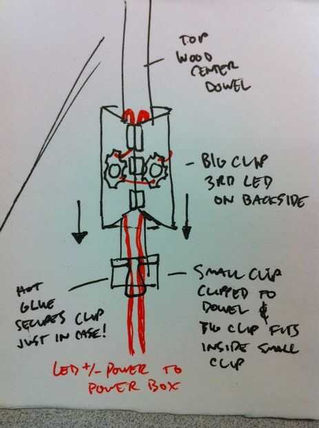 Este pasador de "centro" puede ser cualquier longitud, pero hice es ligeramente más largo que la altura desde la base hasta el punto. Mi plan era poner la clavija en el espacio vacío del titular de la luz y luego fíjelo con el clip de carpeta más pequeños. No tengo fotos de esto, pero lo haré si alguien esta confundido! Realmente depende de cómo usted planea conseguir la luz y el polo a la estructura.