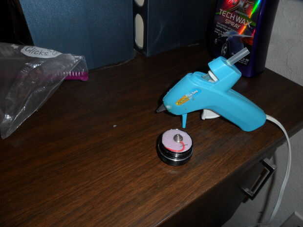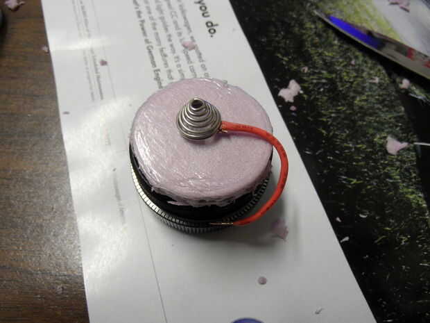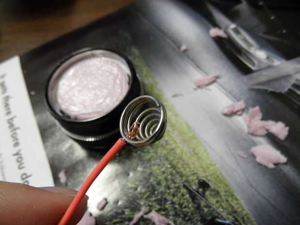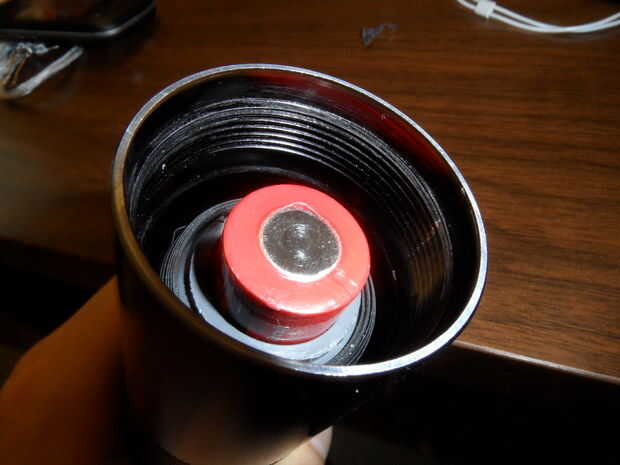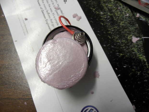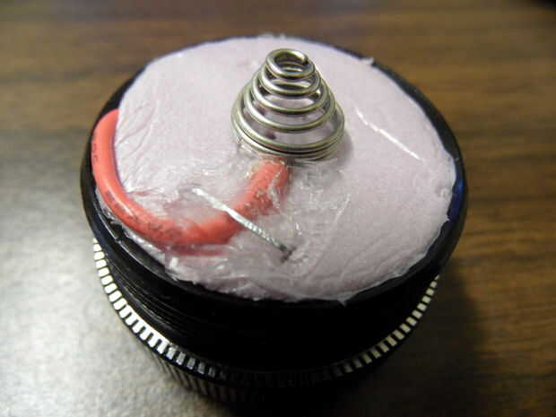 A continuación, debe reemplazar el resorte, como el resorte de la cola es demasiado grande para hacer contacto con las baterías pequeñas. Sacar el muelle y la bombilla de repuesto. Luego, tomar la espuma de aislamiento y corte por lo que se ajusta al ras dentro de la tapa de cola. Tome un pedazo de cable y asegúrese de que hace contacto con el metal en la tapa de la cola y soldar en su lugar. Coloque la espuma de aislamiento ya cortado dentro de la tapa de la cola, asegurándose de que el alambre se pega hacia fuera. Soldar el cable a la tapa de la cola y asegúrese de que el cable se mantiene en su lugar en la espuma. La modificación de la tapa de cola es completa. (**No gire en la luz- una vez la cola modernas pilas nuevas se insertan, se quemará la bombilla incandescente si lo enciende)- pero por otra parte, es básicamente la basura ahora. La primavera se puede guardar para futuros proyectos.