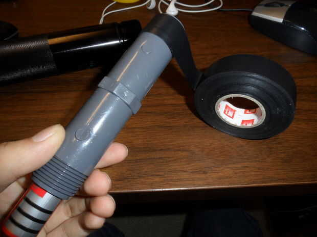 Para ello, tomar el acoplamiento de PVC de 3/4" y envuélvalo en cinta aislante hasta que el diámetro de la cámara de la linterna. Insertar en para comprobar el ajuste, luego llevarlo hacia fuera. (cortar una banda de caucho y envolver alrededor del tubo para guardar algunas cintas)
