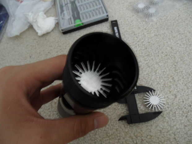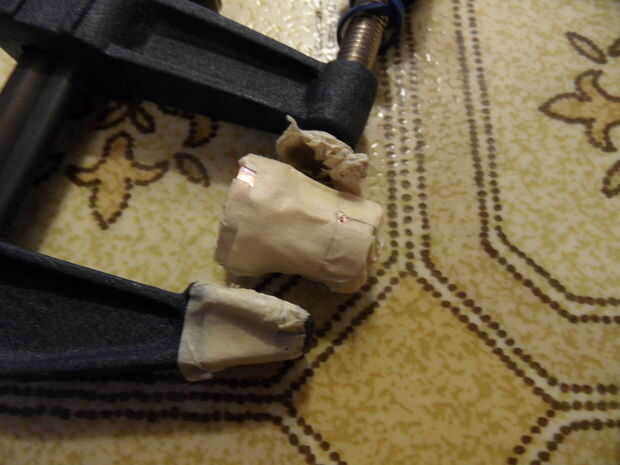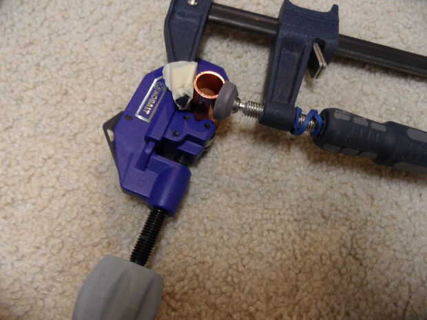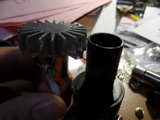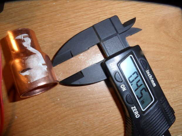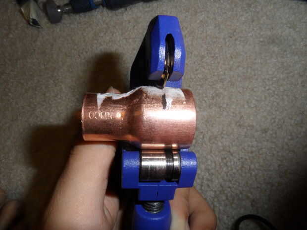 El reductor de cobre de acoplamiento también actúa como un disipador de calor en este proyecto. Usted debe cortar al tamaño correcto para la correcta distancia focal entre la lente y el LED. En primer lugar, tome la pinza y mida. 45" de la parte inferior y marcar con el rotulador. Proceder a cortar esa parte con el cortador de tubos. Esto puede tomar algún tiempo, ya que es muy tedioso. Utilice una abrazadera y poco de cinta para hacer el trabajo más fácil. (usar youtube si no estás seguro de cómo utilizar el cortador de tubos) Proceder al siguiente párrafo.