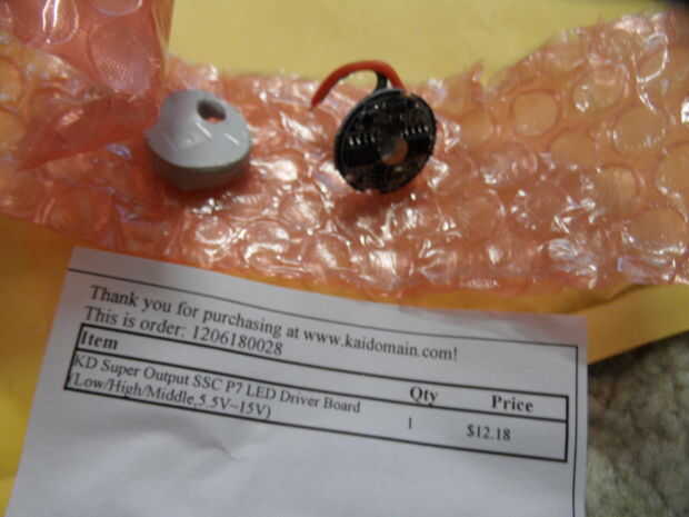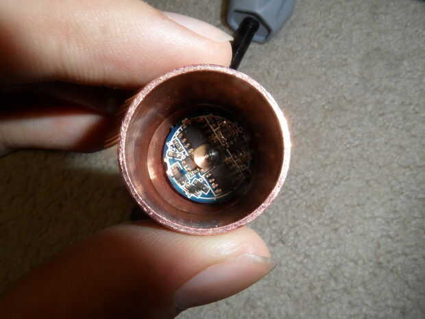 Siguiente paso es preparar el conductor y el disipador de calor del conductor. Prueba de montar el controlador en el disipador de calor de cobre con el lado de alambre (los cables de salida). Prueba a ver si los dos cables pasará por los dos agujeros en la parte superior. Si es bueno, luego soldar los cables de entrada al controlador. Ver imágenes adjuntas. Una vez finalizado este paso, prueba ajustar el controlador nuevamente dentro del disipador de calor de cobre. A continuación, aplique alcohol de frotamiento en el q-Tip y limpie el interior del cobre. Mezcle el adhesivo térmico ya que las instrucciones del sitio web Dile a hacerlo y aplicarán liberalmente dentro del disipador de calor de cobre. Excesivo en este caso, está bien. Inserte el conductor interior con los cables de salida que se pega por los dos agujeros superiores. Asegúrese de que no quedan huecos entre los lados del conductor y el cobre. Mantener en su lugar hasta que se pega por sí mismo. Luego, soldar los cables rojo y negro a los cables de salida. (Utilice tubería de encogimiento de calor a la soldadura) (aproximadamente 3 pulgadas de alambre rojo y negro)