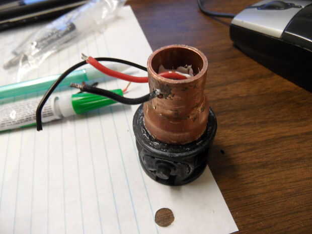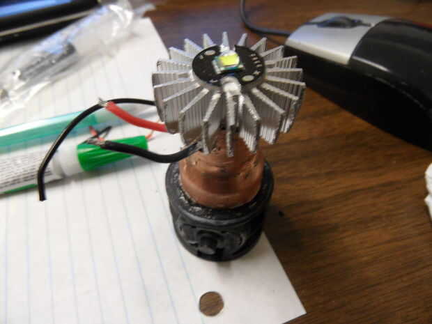Siguiente, pegamento del disipador de cobre a la Asamblea de interruptor negro. Después de eso, inserte el conjunto del interruptor todo a través de la parte posterior del tubo de la linterna.