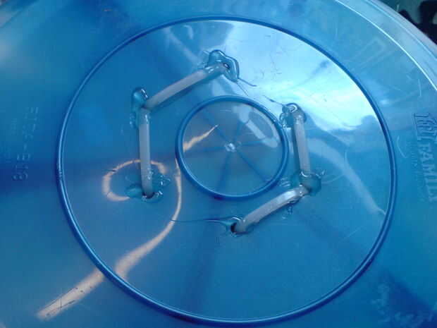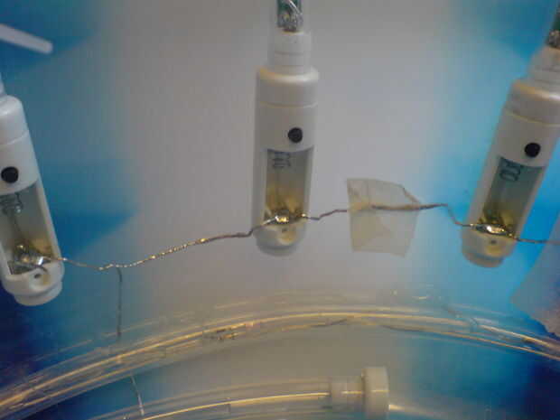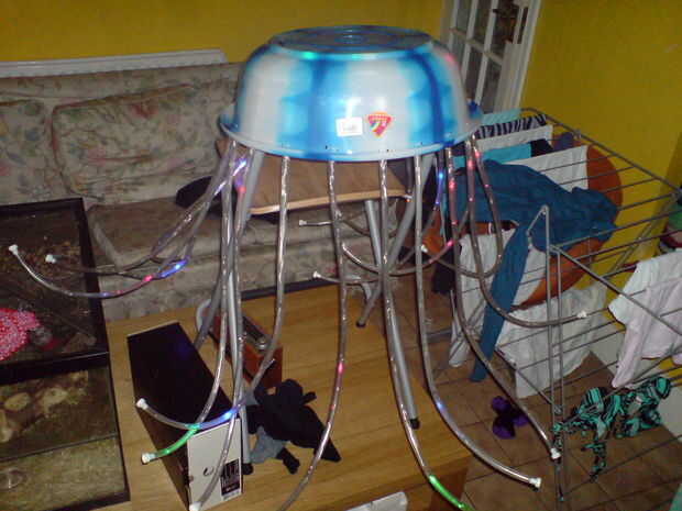 Este es un visualmente impresionante traje con luces LED de la cuerda y un lavabo de lavado de plástico para crear una cosa de Medusa bioluminiscente de alta mar.