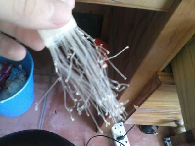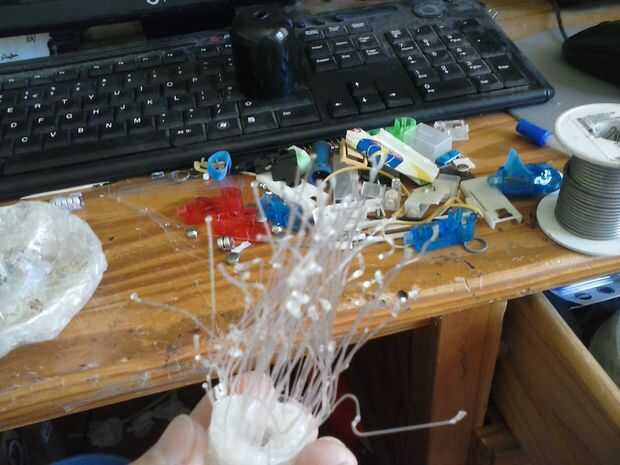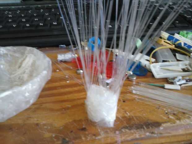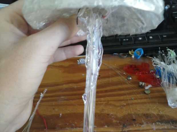 Una vez terminado con esto, uso el soldador para deformar, doblar, distorsionar y reducir la mayoría de los aguijones. Simplemente toque los extremos de ellos con el soldador y la punta se funde en una bola pequeña. Esto hace toda la diferencia a cómo realista mira las medusas completa.