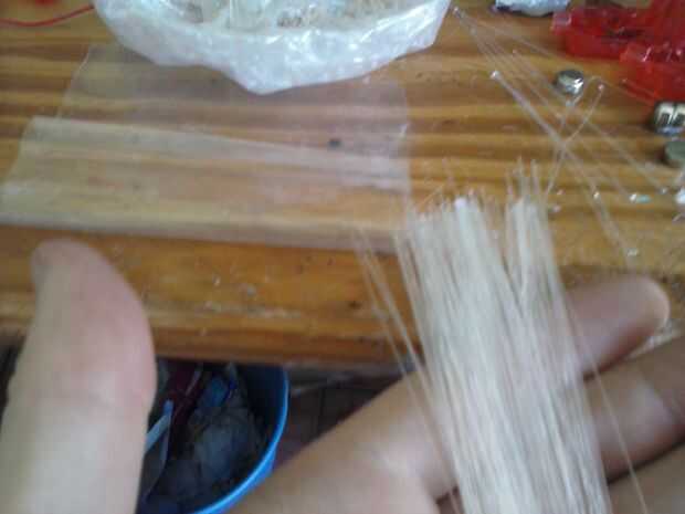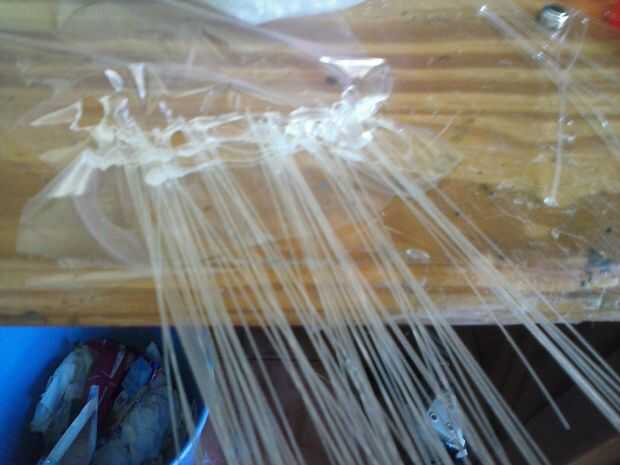 Para 5 aguijones más gruesos a más, gire alrededor de 8 fibras juntas y el calor hasta que conservan esta forma. Hacer lo mismo a las puntas, como antes. InThe última pic, verás que sólo utilicé pegamento caliente para disimular el apoyo central como parte de las medusas.