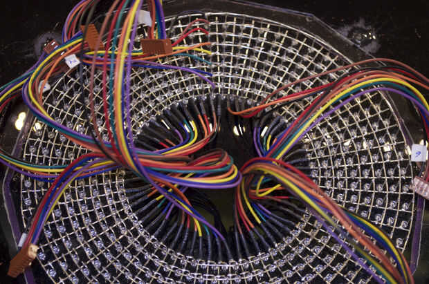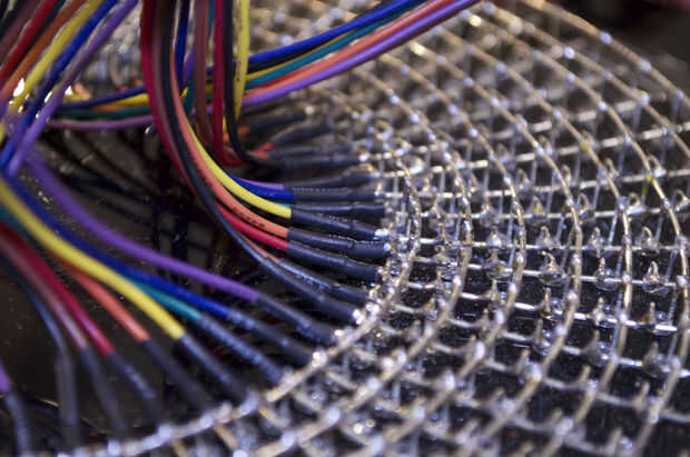 2. Ocho conectores de cable 8-pol a las 60 columnas (ánodos) de la matriz de la soldadura. He utilizado conectores 8 pol ahora tengo 64 cables disponibles pero sólo tenemos 60, la izquierda cuatro pongo cinta de goma. También puede mejor y usar siete conectores 8-pol un un conector de 4-pol lo tienes exactamente 60 conexiones