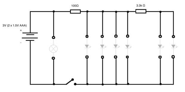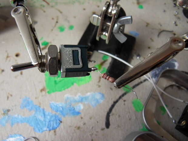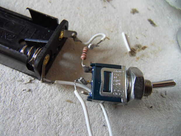 El resistor de 100 ohmios se une a todo, pero la bombilla. La bombilla no funcionaría con 100 ohmios. La resistencia de ohmios k 3.3 se une a uno de los zócalos y las dos regletas de terminales. Los terminales se utilizará para cualquier LEDs de baja corriente.