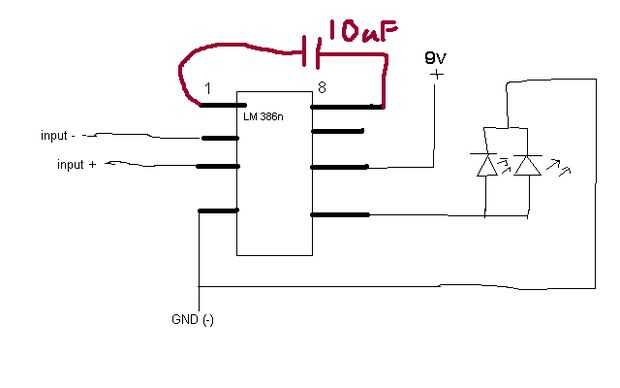 Este es el esquema que funciona 100%!!!!!! la parte que está en rojo es opcional, hará que las luces se enciende más o menos, el condensador aumenta la amplificación de un 20% a 200% y si quieres que sea el 50% se añadirá en un 1.2 resistencia k el condensador, puede usar cualquier resistencia que se quiera, pero cuanto mayor sea el valor de la menor amplificación se obtiene , que significa el LED será regulador!