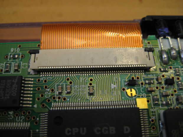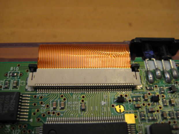 Una vez que tengas que hacer, necesita desconectar la pantalla. Levante ambas clavijas de plástico negro hacia el cable de cinta naranja al mismo tiempo, luego levante el cable desde el conector.