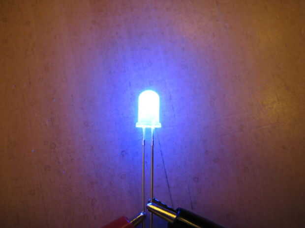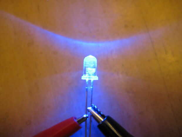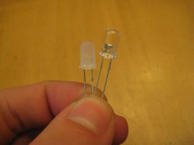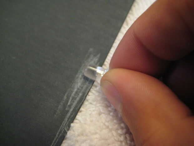 Ahora es el momento de difundir los LEDs. Hay un montón de guías sobre cómo difundir LED, así que no entraré en mucho detalle aquí. Pero básicamente solo frotas el LED del papel de lija para que el LED se ve "más áspero". Asegúrese de que usted consigue el LED todo, o tienes manchas. ¿Por qué difundirlo? Difundiendo el LED hace no tan brillante, pero hace la luz más extendido, que es ideal para este proyecto. Fotos tres y cuatro mostrará la diferencia entre un LED difuso y una acción.