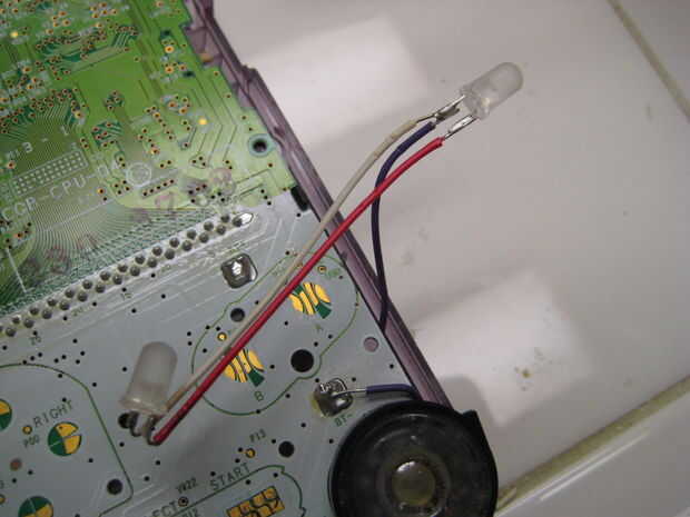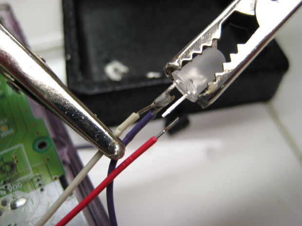 Por último, soldar un cable corto del lado positivo de su LED el positivo de la batería, con la etiqueta BT +. Mi LED es clasificada para 3.1v, pero si tus LEDs son clasificados para una tensión más baja, puede que desee añadir una resistencia pequeña (100 ohmios) para extender la vida de ellos.