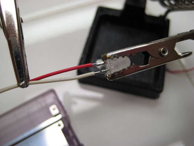 Después de poner el interruptor en, suelde uno de los cables al terminal de batería negativo marcado BT-encima de la parte blanca de la PCB. Cortar las puntas más cortas en el LED, luego soldar los cables rojo y negro a uno de ellos. Los otros extremos de los cables a su LED, asegurándose de que usted preste atención a la polaridad de la soldadura. Se puede saber en el LED que lado es positivo porque el lado negativo tiene una plana en la base.