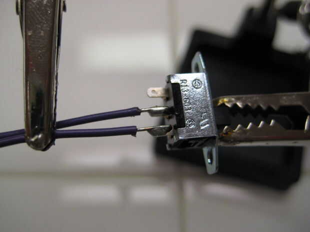 Tome su cambio y soldar dos cables al interruptor. No usé rojo y negro, pero se puede si lo desea. IMPORTANTE: Coloque el interruptor en su agujero antes de que suelde los cables a cualquier cosa, o tendrá problemas más adelante.