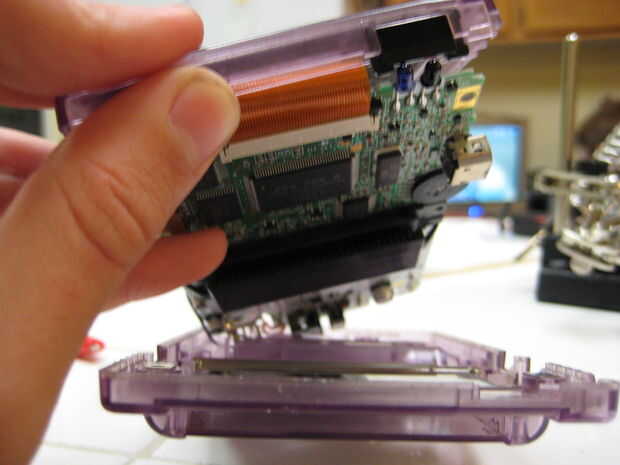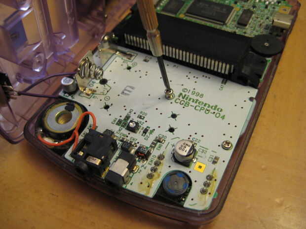 Ahora viene la parte realmente difícil; Juntándolo todo nuevo. En primer lugar, conecte el cable de cinta de la pantalla. Se trata de un tipo de disco duro, especialmente si usted está tratando de tomar una foto al mismo tiempo. : P Asegúrese de que levantar el plástico las clavijas, el cable de cinta en, luego lleve las clavijas hacia abajo otra vez. Poner todos los botones de volver y poner los cojines detrás de ellos. Rápidamente Presione el PCB contra ellos, para que no caiga hacia fuera. Luego enrosque los tres tornillos hacia los agujeros correctos, que están convenientemente marcados con pequeños círculos alrededor de ellos.