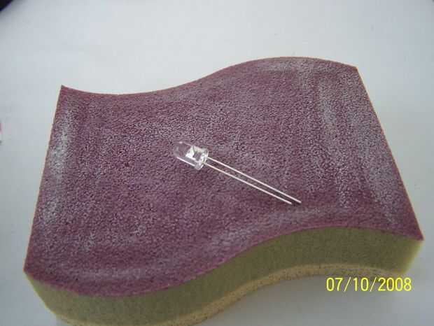 Ahora necesita difundir los LEDs para ellos para poder difundir su luz hacia fuera, no tan solo lo apunte en una dirección. Le proporcionará un vínculo para obtener instrucciones sobre cómo difundir un LED, pero básicamente frotas el LED contra la lija hasta que la superficie del LED es "áspera". Aquí está el enlace sobre cómo difundir un LED.