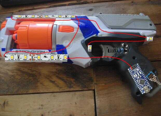 Las líneas rojas representan el flujo de datos a lo largo de la tira del LED WS2811, empezando en el Arduino Nano y terminando en el iluminador de gatillo.