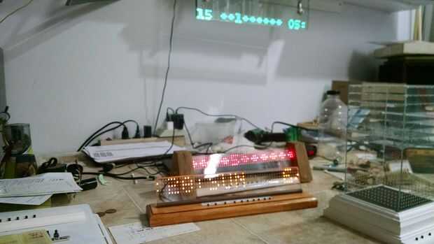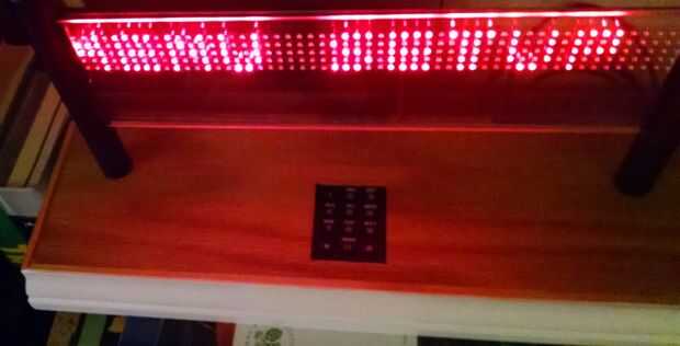 This dot matrix display consists of 384 discrete red 5mm LEDs.  Los LEDs están dispuestos en forma de tubo cilíndrico.Las capas están formadas por arreglo de 24 LEDs en forma de círculo.  Los ánodos de cada LED en una capa se sueldan con estaño alamb