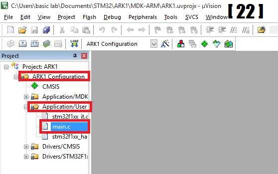 Ahora, haga clic en "+" firme antes de que le carpeta de configuración de proyecto en este caso, "ARK1 configuración", luego haga clic en "Aplicación/usuario" carpeta "" signo +, el doble clic sobre "main.c". {Ver imagen [22]}