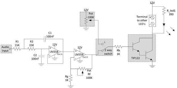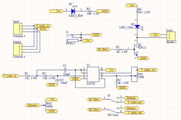 - Cuando el interruptor si a la derecha, pote 1 dejará usted controlar la ganancia de la señal de audio aplicada a la resistencia conectada a la base del transistor.