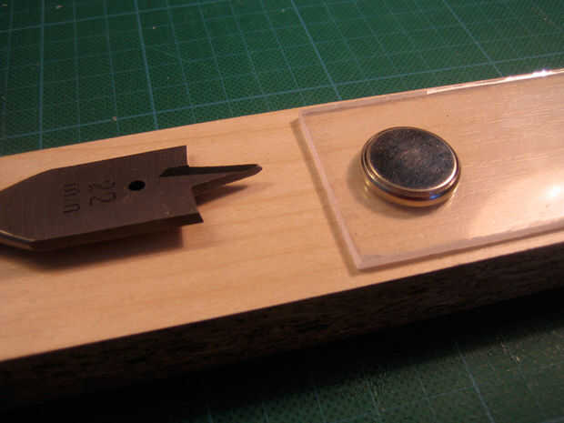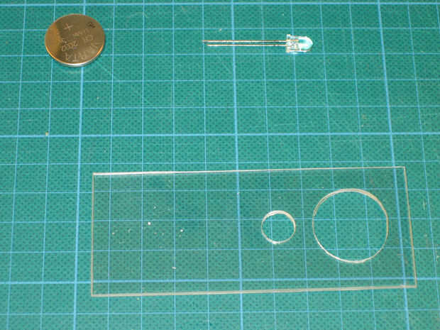 Ahora toma un perforador 22mm y taladre el agujero para la batería. Deberiamos ser una batería de 3V (2032). Colóquelo sobre un lado de la placa. Al lado de este orificio, perfore el orificio (10 mm) para el led.