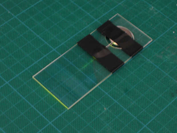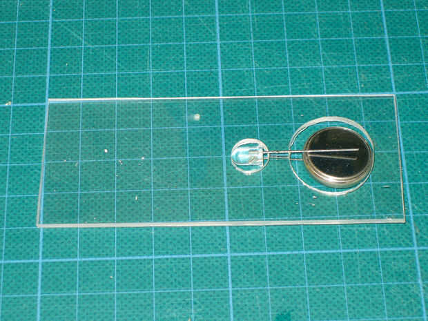 Tomar el LED (tomé una verde ultrabright.) y colocarlo en el agujero de 10mm, las patas hacia el agujero de la batería. Si está hecho, poner la batería en el orificio de 22mm. La pata larga de la led deberiamos estar en el + de la pila. Ahora la cinta algunos cinta aislante para fijar las patas del led de la batería y para cubrir el led, que quiere ciegos.