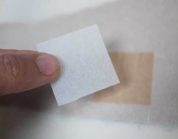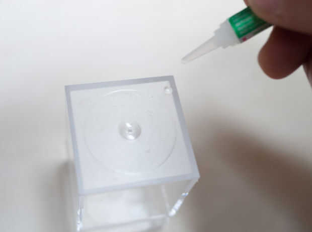 Con el cuadrado listo, aplicar pequeños toques de pegamento en las esquinas de la caja y presionar el papel sobre ella.