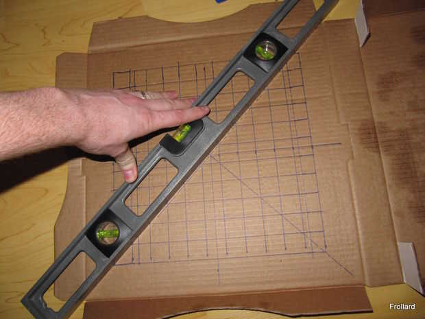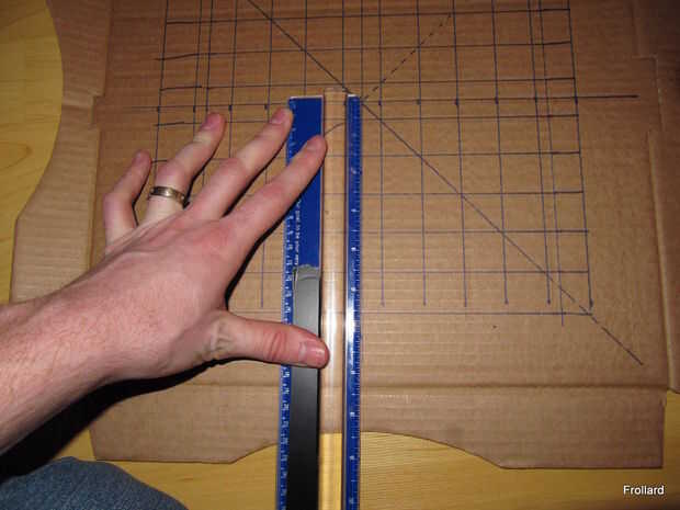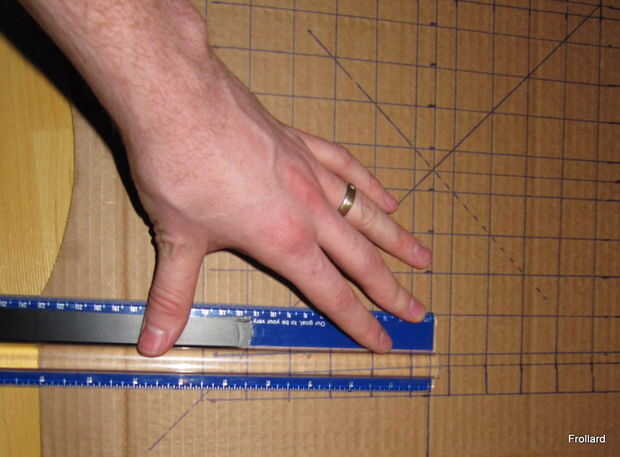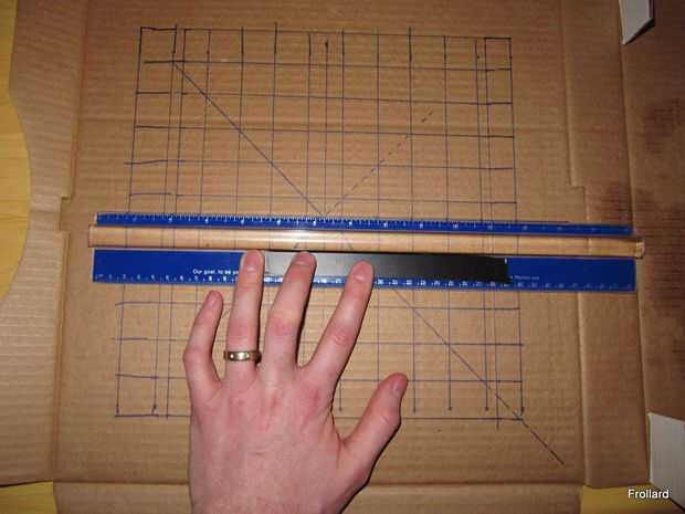 (Foto 5) Medida de cada línea central en ambos extremos de 5.5 pulgadas hacia afuera en cada dirección (para hacer un 11" centeredbox). Esa caja se dividen en 11 secciones de 1" y tendrás una red poco aseada!
