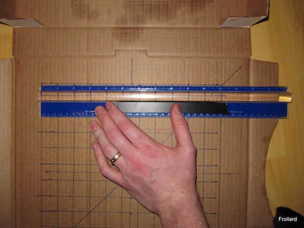 (Foto 2) Hacer una línea recta siguiendo las líneas de la corrugación. Mida desde la línea de centro hasta el borde de la caja. En mi caso 7 1/8".
