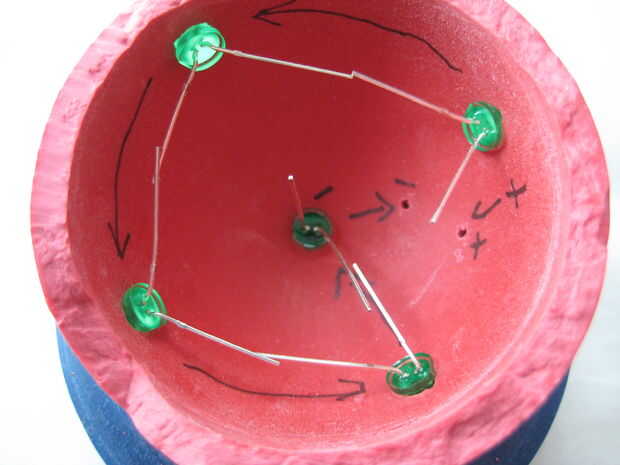 A continuación taladre dos agujeros más pequeños para pasar cables eléctricos. Un cable desde cada extremo del circuito, el los orificios deben estar cerca (pero no demasiado cerca) los más grandes agujeros para los LEDs al inicio y al final de la serie. Echa un vistazo de la tercera foto que muestra cómo las cosas van a mirar desde el interior de la bola.