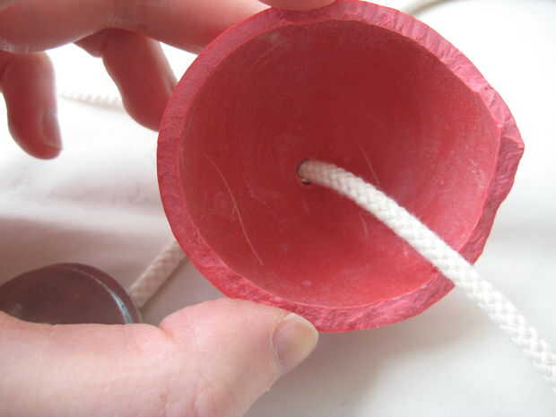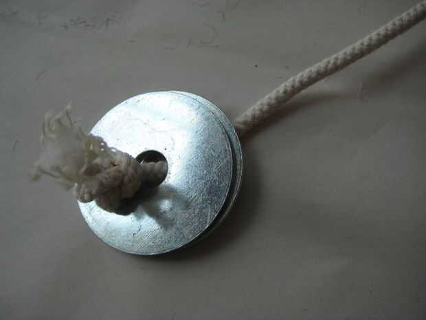 Ahora puede colocar la cuerda. Un nudo en un extremo de la cuerda y poner un poco de pegamento en ella por lo que no no. Un par de arandelas grandes o artículos similares sobre la cuerda para dar el poi cierto peso del hilo de rosca. Luego, pase el extremo de la cuerda por el agujero de la cuerda y levante las arandelas para que encajen dentro de la mitad de la bola.