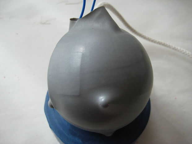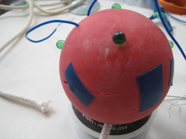 Cortar el cuello de un globo y deséchela. Estirar el globo hacia fuera e inserte la bola. La cuerda y los cables deben entrar por la abertura del globo. Con tijeras de punta, ajuste la abertura del globo para que quede plana contra la bola. Luego cortar pequeños agujeros para cada LED. Tenga cuidado aquí - es fácil hacer los agujeros demasiado grandes. Corte un agujero muy pequeño en la parte superior del LED y luego tire hacia abajo para que se extiende alrededor de la LED.