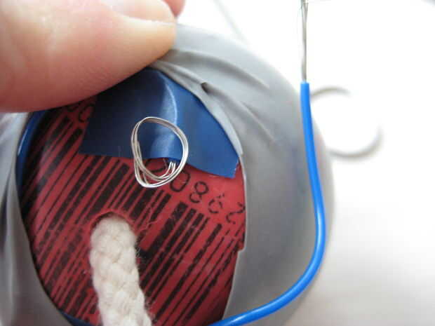 Para cerrar el interruptor, poner el segundo cable en la parte superior el hilo conductor y, a continuación, pegue el lado del gancho del velcro en la parte superior para mantener en su lugar. Cuando el interruptor está apagado, usted puede rellenar el alambre y el lado del gancho del velcro en el borde del globo para no perderlos.