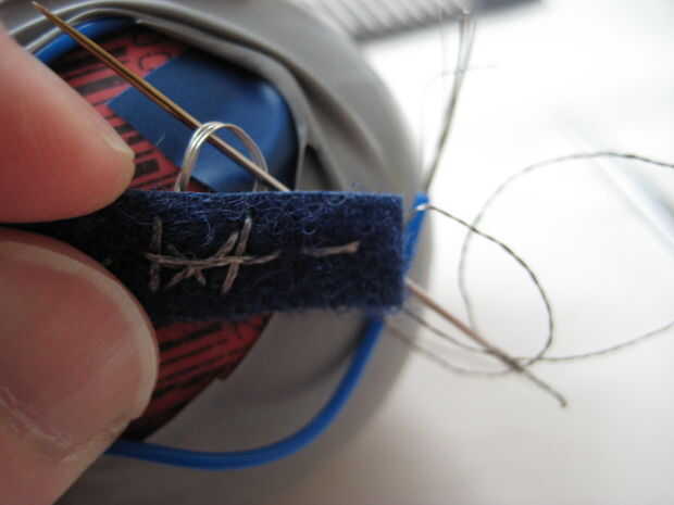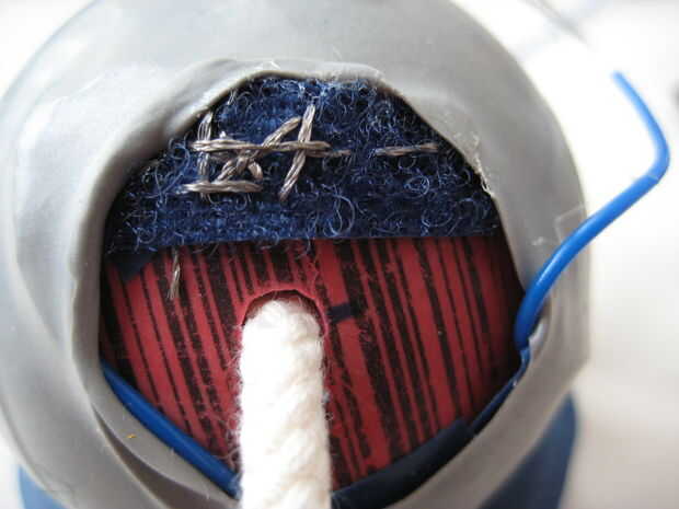 Para hacer el interruptor, corte un pedazo pequeño de velcro (lados del lazo y el gancho). Usando el hilo conductor, cose hacia adelante y hacia atrás en el lado del lazo del velcro. Forman uno de los alambres en forma de bucle y coser el hilo conductor a través del lazo varias veces para hacer una buena conexión. Adhiera el lado del lazo del velcro sobre el bucle de alambre. Si se sitúa parcialmente en el globo, el globo le ayudará a mantener en su lugar mientras el pegamento seca.