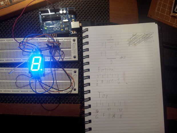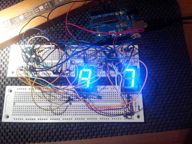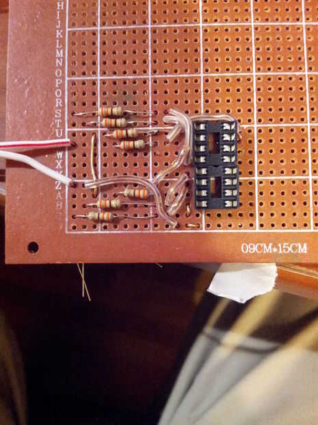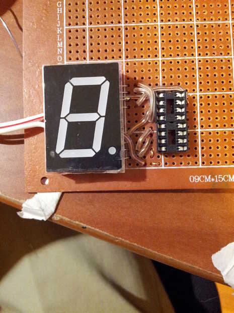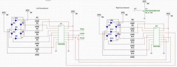 Procedí a armar el marcador izquierdo siguiendo el diagrama esquemático (tercera imagen). Los marcadores son Margarita juntos - el pin de datos de un turno registro alimenta en pin 9 del otro registro de desplazamiento. Esto hace que ambos registros de cambio sólo usan 3 pines, en lugar de 6 pines, en el Arduino.