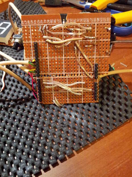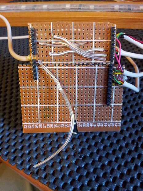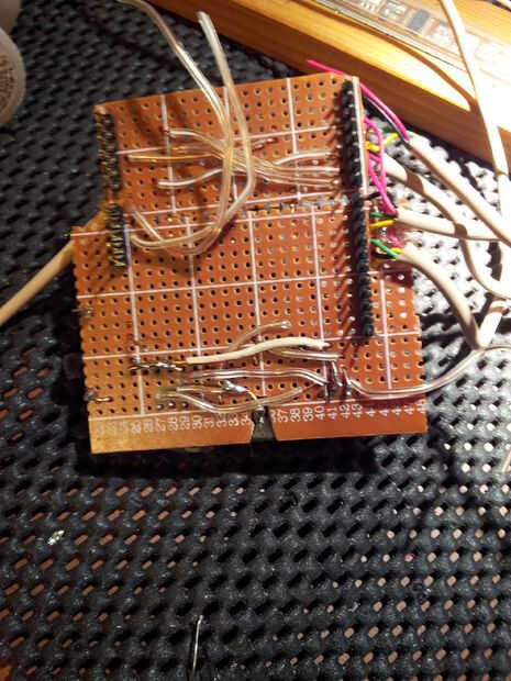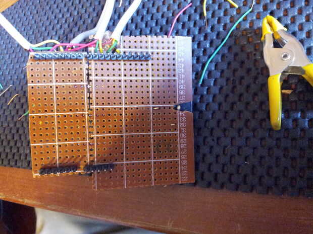 En mi Arduino Uno, la distancia entre patillas 7 y 8 era todo para mi perfboard así que tuve que usar dos piezas de perfboard luego soldados ellos juntos una vez el espacio era correcta (primera foto). Luego que soldados en los encabezados de 1 x 4. Si usted puede, comprar las cabeceras de pasador largo porque es bueno tener mayor espacio por debajo (yo usé las cabeceras pin cortas) (segunda foto). Asegúrese de que usted al menos soldadura en suficiente encabezados para cubrir digitales pins pines analógicos 1-13, 2, 4 y 5, vin y al menos una tierra.