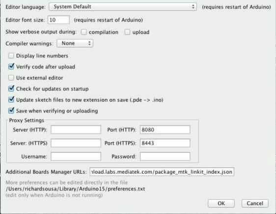 2. instalar y abrir el IDE de Arduino, abra Preferencias de, encontrar tarjetas adicionales manager y pegar: http://download.labs.mediatek.compackage_mtk_lin... en el cuadro de texto.