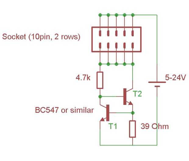 Necesita dos transistores como el BC546 o BC547, dos resistencias (4.7kOhm y alrededor de 39 ohmios), un enchufe y una especie de una toma de corriente.