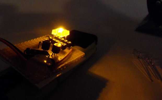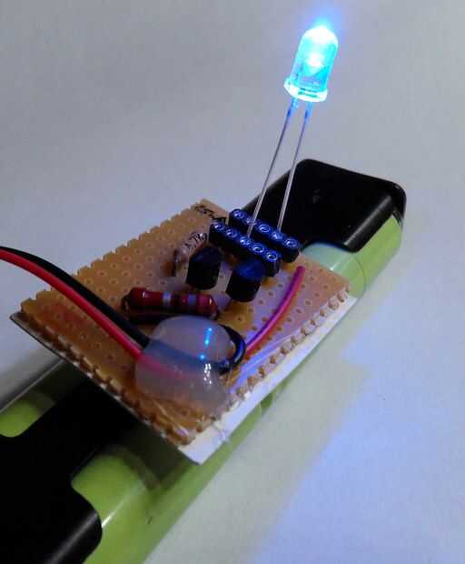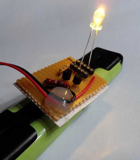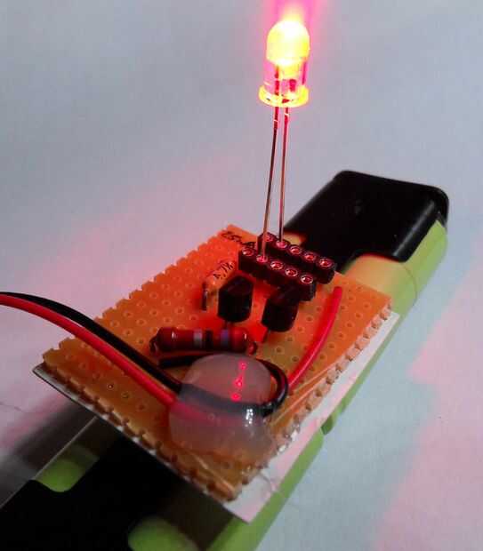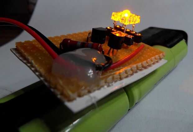 El truco de este circuito es que la base de T1 está conectada a un emisor de T2 y la base de T2 está conectada al colector de T1. Así que estos dos transistores rivalizan para la toda corriente que fluye a través del LED.