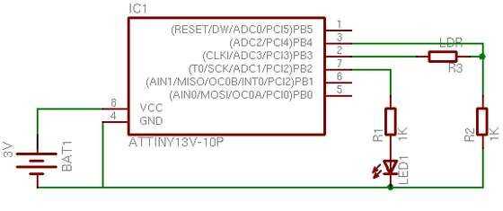 El valor de la resistencia R2 depende el LDR usada. 1KOhm funciona para mí. Puede que desee utilizar un potenciómetro para encontrar el mejor valor. El circuito debe ser capaz de detectar cambios de luz en luz normal día. Para ahorrar energía, PB3 sólo está establecido en alto, si se realiza una medición.