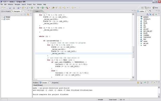 Después de haber compilado su fuente, usted tiene que transferir el archivo hexadecimal al controlador. Eso se puede hacer tu PC al conectarse el circuito ISP (en programador de sistemas) o utilizando programadores dedicados. Usé un programador dedicado como hace el circuito un poco más fácil ahorrar algunos hilos y un enchufe. El inconveniente es que tienes que cambiar el regulador entre el circuito y el programador cada vez que desee actualizar el software. Mi programador viene de http://www.myavr.de/ y utiliza USB para conectar a mi notebook. Hay muchos otros alrededor y usted puede incluso construir sus propios medios.