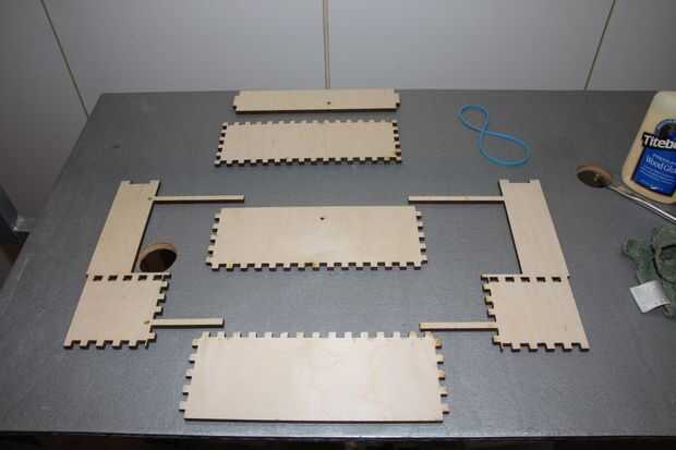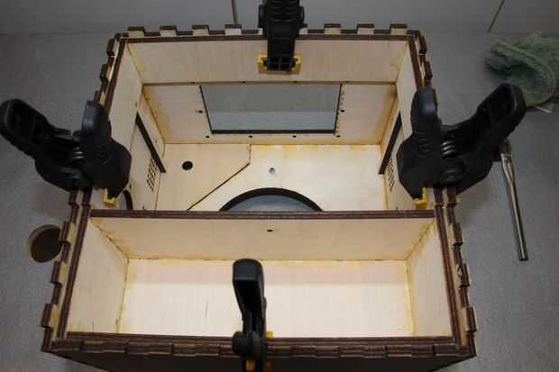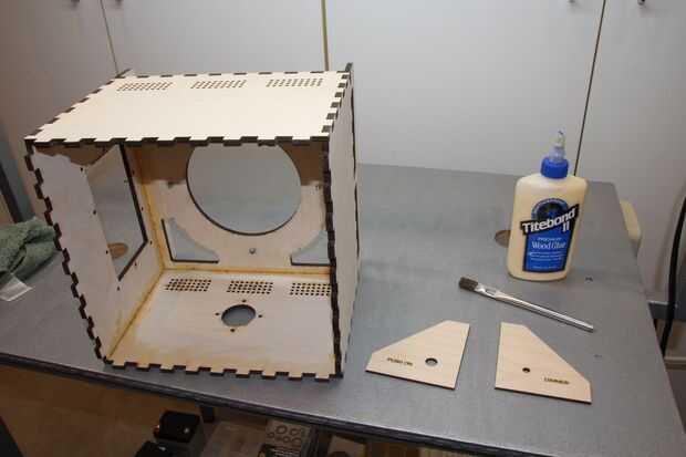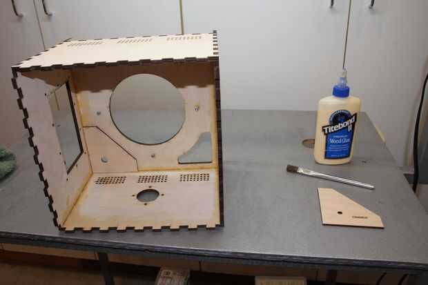 Aquí es donde comienza el partido. Dry fit esto y luego seco introducirlo otra vez. Coloque el bastidor como se muestra en la imagen. Hay dos lados con las piernas. las piernas están marcadas con una S para abreviar y L por mucho tiempo. Las dos piernas cortas deben aterrizar en los montajes de control del panel frontal. La caja debe estar en el lado opuesto de la abertura lateral grande. Una de las dos piezas similares sin piernas tiene un pequeño agujero en el medio, debe ir hacia el centro de la caja. El subchasis está instalado con las patas apuntando hacia el panel frontal. Pegamento para arriba e inserte. Asegúrese de que la parte inferior de las patas en el panel frontal y panel de montaje. El borde posterior del premarco estará nivelado con el interior cara del panel posterior excepto donde la caja empotrar 1/8 pulgada para el retenedor de puerta en. Siga con cuidado o va a llorar. Confía en mí en esto.