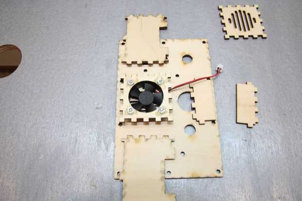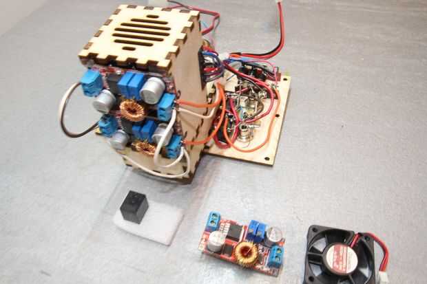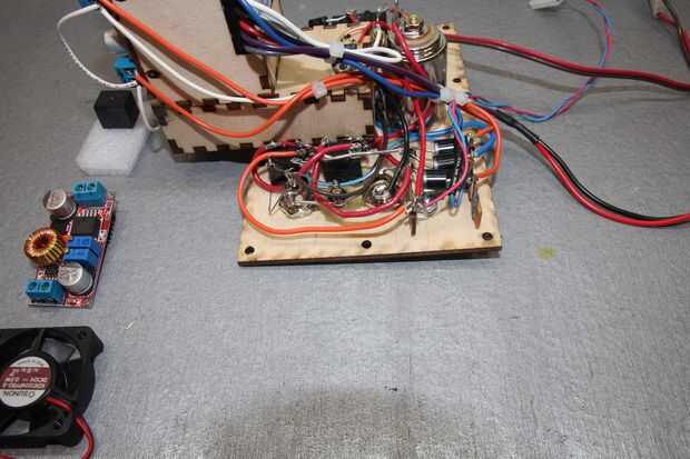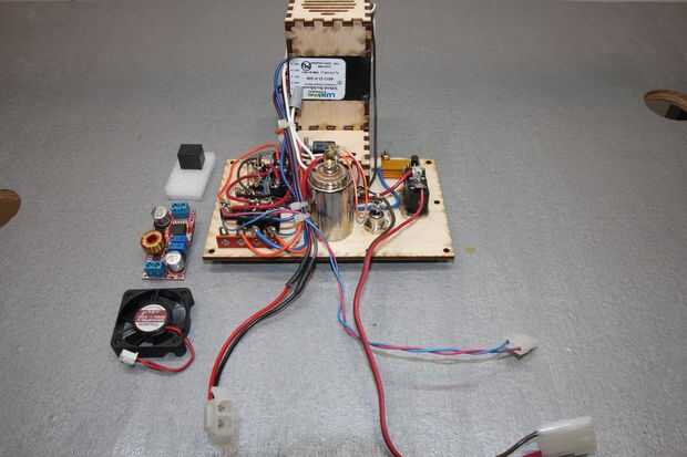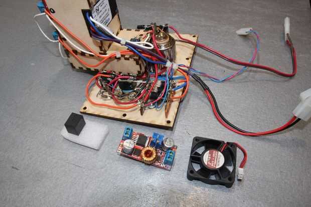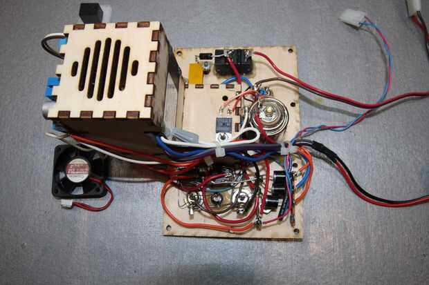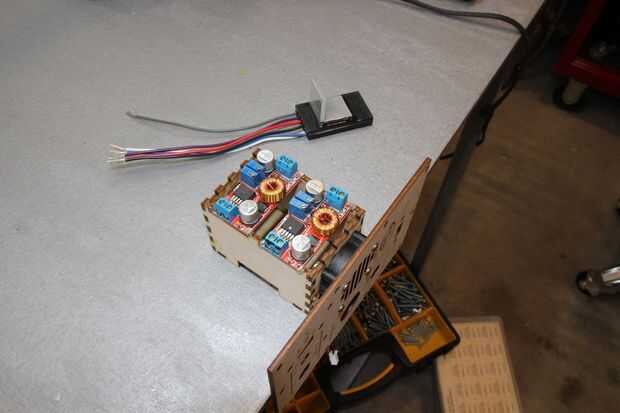 Montar la torre de enfriamiento, es una simple caja que se monta en la parte superior del ventilador. Es más fácil el sándwich del ventilador entre el panel trasero y el panel de fondo de torre enfriamiento y perno juntos antes de montar el resto de la torre de enfriamiento. Poner pegamento caliente en las tuercas para hacer un mans pobre versión de una tuerca prisionera. Esto le permitirá eliminar la torre si es necesario. No se muestra es el disipador de calor de metal pequeño que os adjunto en la parte posterior del módulo LED driver con epoxy termal. Probablemente no es necesario, pero más es mejor. Use cualquier tamaño que no bloquea el flujo de aire o los módulos de suministro de cortocircuito. El conductor del LED y los módulos de potencia DC montaje en la torre de enfriamiento con una gota de pegamento caliente en cada esquina. Pueden eliminarse fácilmente por calentamiento con una pistola de aire caliente si es necesario. Te darás cuenta que mi torre de enfriamiento se ve diferente que el que está construyendo. Mina tiene un adaptador de offset que se agregó después que "tiró un Homer" (o un dohhh! como me gusta llamarlo) en el diseño inicial. Ustedes no necesitan esto. Montar el resto de las piezas de panel. El interruptor de la batería y relés se necesita caliente pegamento para sostener y posiblemente los conectores de poder de barril dependiendo del estilo. ! Importante! Marcar las conexiones de entrada y salidas del módulo de DC en la madera donde se puede ver después de la instalación.