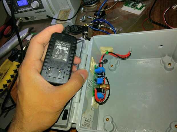 usé una caja de cristal con bisagras de fibra para poner toda la electrónica necesaria y para montar la matriz de led. En la foto yo estoy sosteniendo un adaptador de 12 voltios para alimentar el módulo de cargador de cc cv dentro del recinto. Este módulo que tengo de Amazon para 6usd. Es un cargador de dos etapas que es perfecto para cualquier batería de litio. Para usar primero ajuste el potenciómetro de cv para el voltaje de la batería, 4,2 voltios por la célula de la serie. A continuación ajuste el potenciómetro de cc con el multimetro en modo amperímetro y los conductores de cortocircuitos en los terminales de salida.