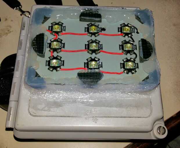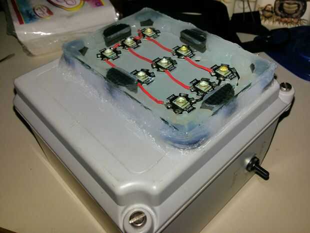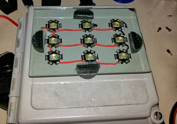 necesitaba un protector para proteger los led emisores y también para proporcionar impermeabilización. Un panel de vidrio fue asegurado utilizando silicona transparente (un héroe anónimo). Agua, suciedad o mugre se mantendrían lejos de mi precioso leds.